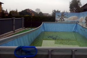 Die Grünfläche um den Außenpool herum besteht aus einem Plaste-Kunstrasen. Der Pool selber war Mitte Oktober abgelassen und enthielt nur einige Bläter. Doch das ist Ende Herbst wohl kein Drama für die Gäste. An heißen Sommertagen vermittelt der große Pool garantiert viel Badespaß für die ganze Familie.